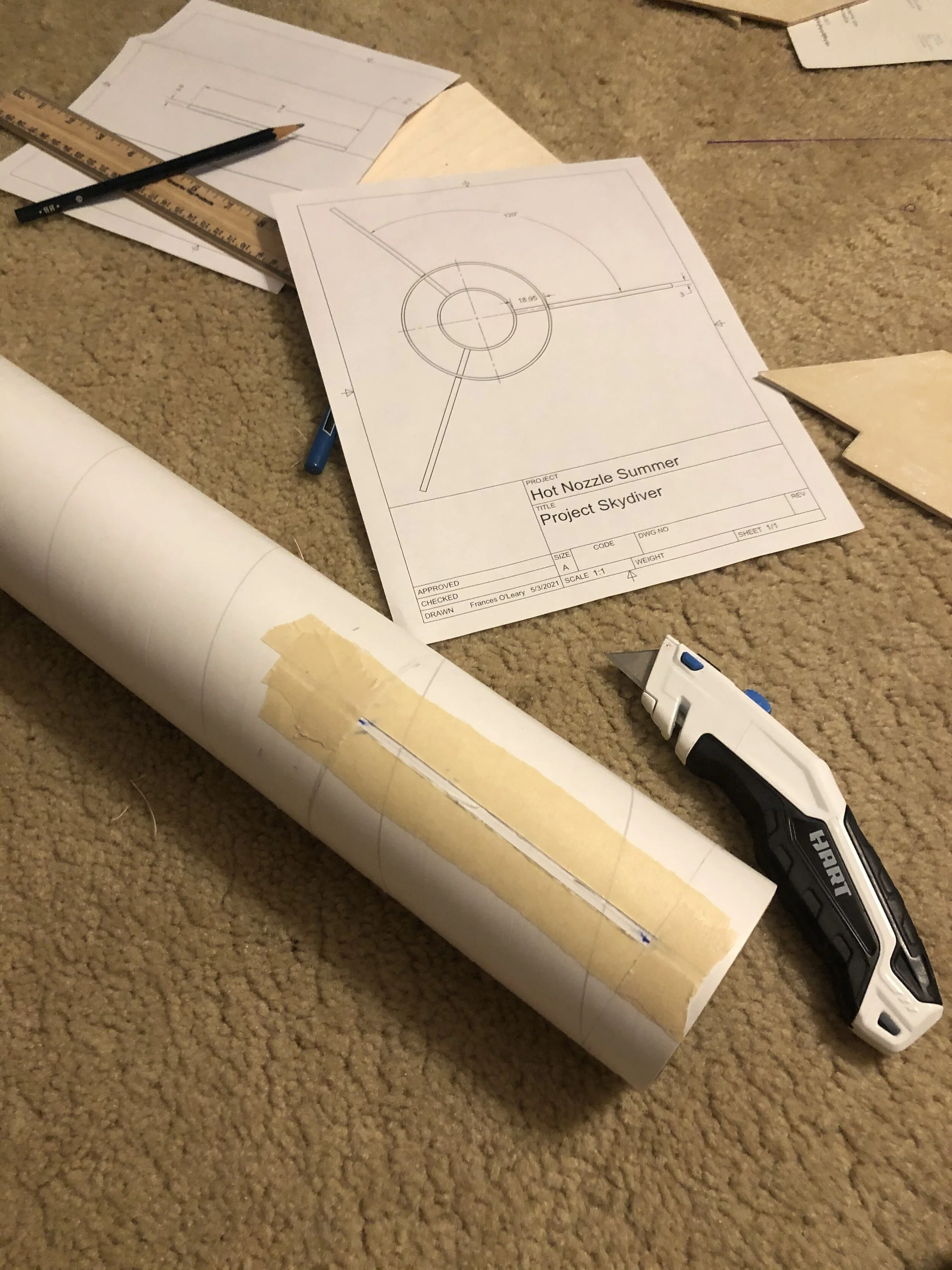 Now that this was done, I just had to cut fin slots in the airframe and insert the assembly while applying epoxy to each of the centering rings. To cut the fin slots I just used a box cutter and Fusion360’s drawing function, which allowed me to print out 1:1 2D drawings directly from my CAD model that I could use as templates. This is shown below: